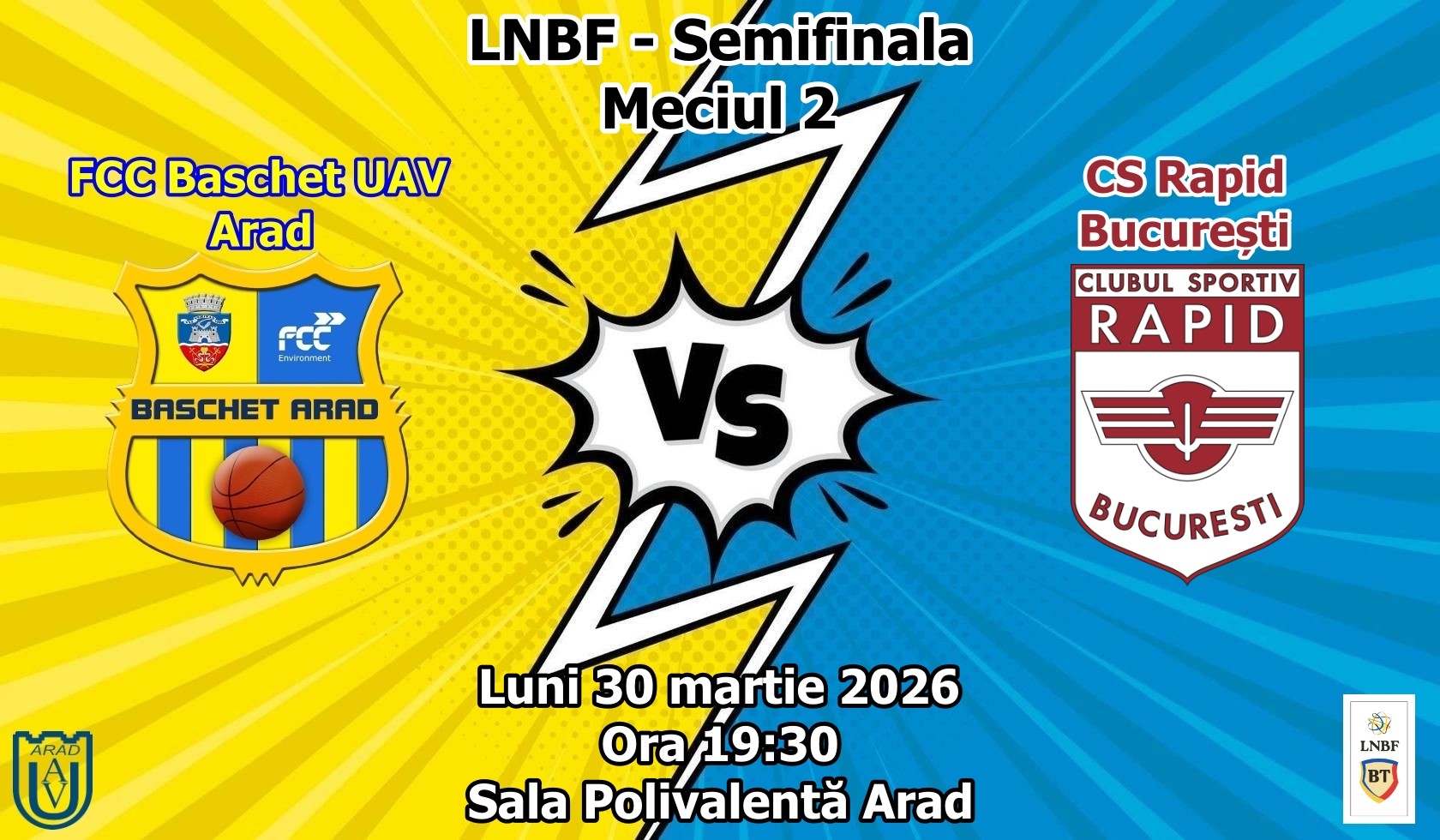 Luni, de la ora 19:30, jucăm meciul doi al semifinalei Ligii Naționale de Baschet Feminin BT, acasă, cu Rapid București. Adversarele noastre au 1-0 după ce s-au impus în primul meci cu 78-71.